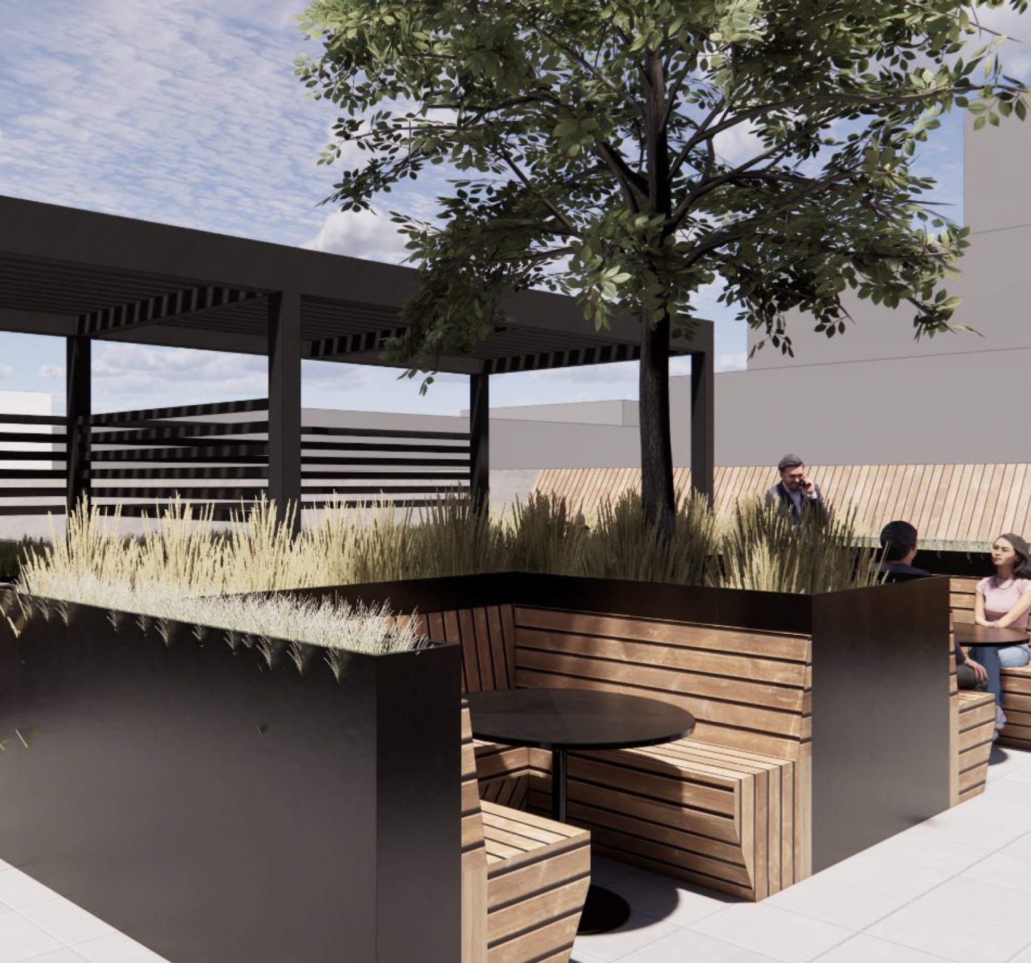 The 3,000 SF landscaped roof terrace harmonizes indoor and outdoor work spaces by creating an inviting and laid-back atmosphere, fostering space for teamwork, tranquility and respite from the desk.